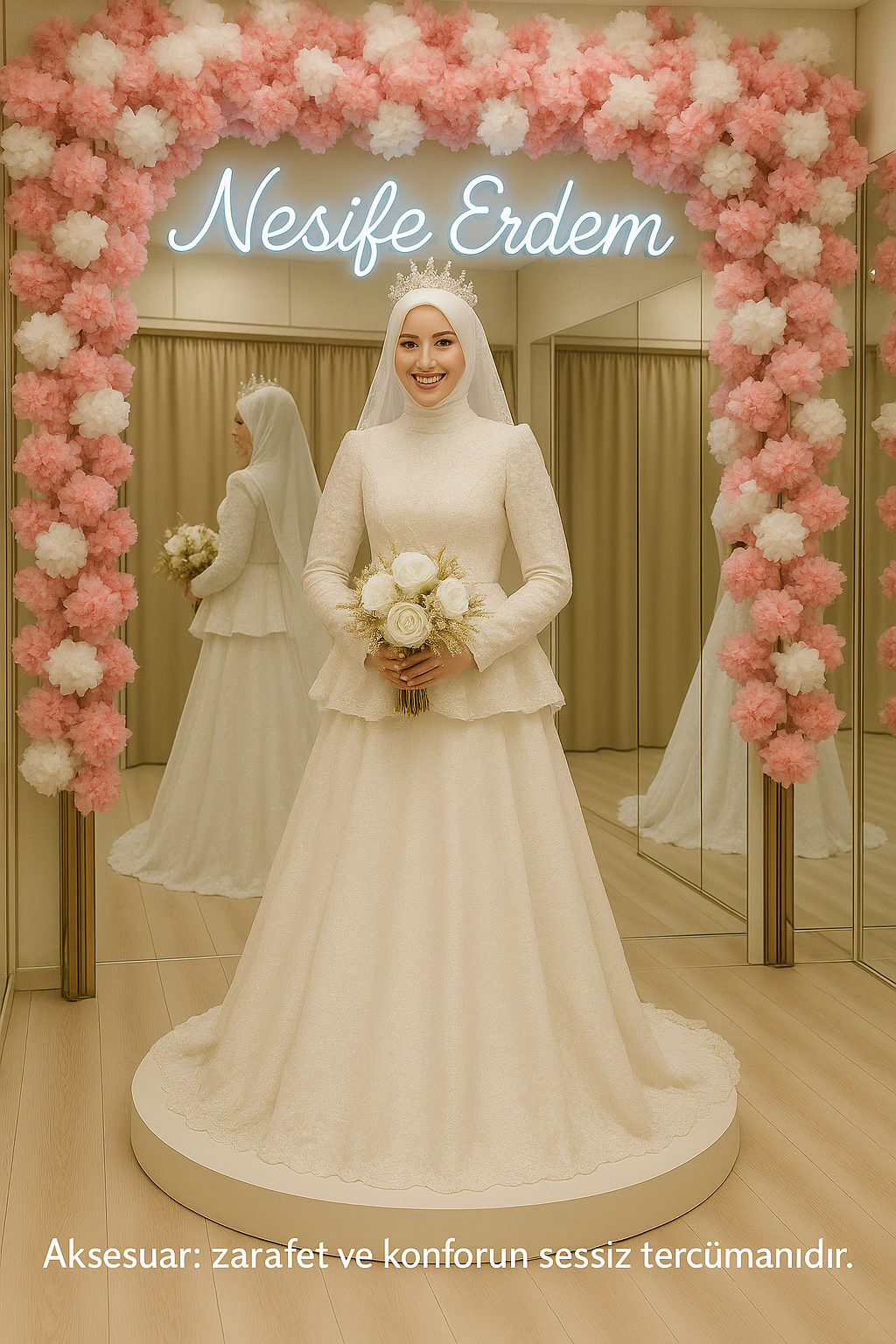 Her aksesuar, bir bütünün tamamlayıcısıdır. Nesife Erdem Gelinlik atölyesinde tasarlanan her parça; gelinliğin çizgisi, kumaşı ve ruhuna göre seçilir. Bu bütünlük, hem estetik hem de hissel bir ahenk yaratır.