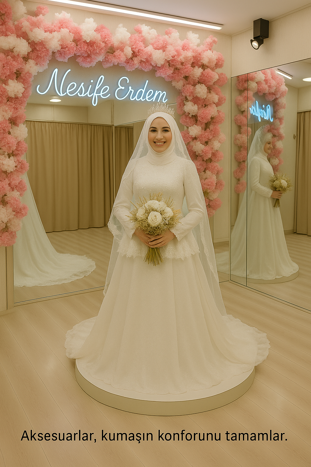 Nesife Erdem Gelinlik’te, bu bütünlüğü yakalayabilmek için hem geleneksel hem de modern çizgilerle çalışırız. Çünkü aksesuar sadece süs değil; konforun tamamlayıcısıdır.