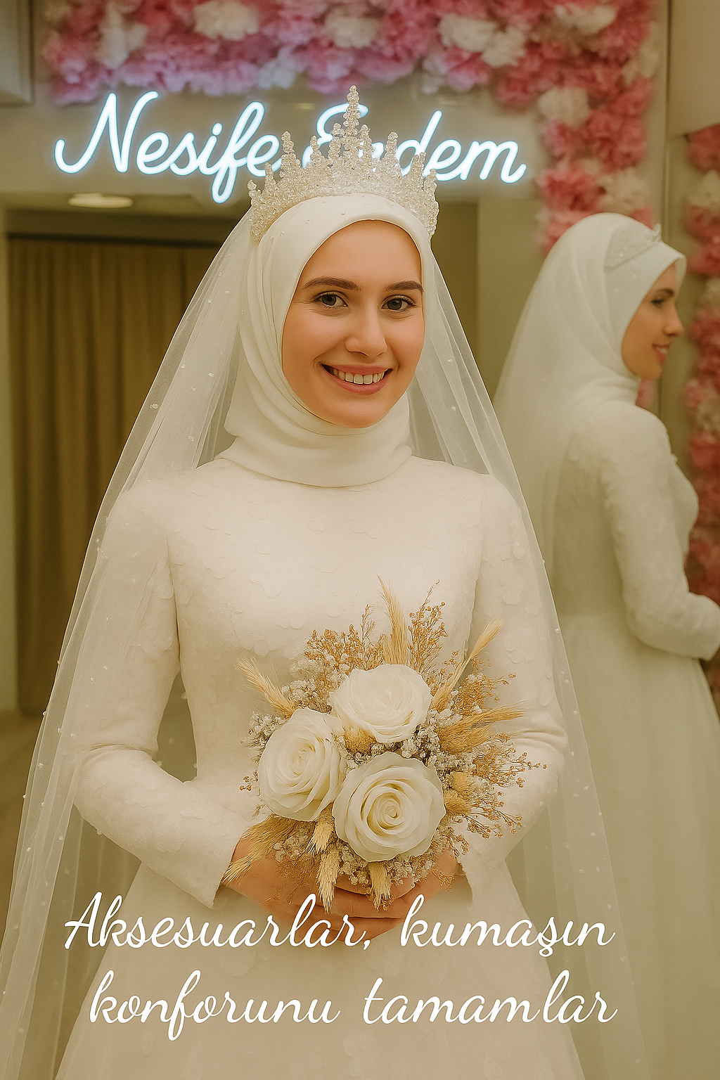 Kumaş ve konforun zarafetle buluştuğu noktada; çiçek, duvak ve taç, gelinliğinizi masala dönüştürür. Nesife Erdem 2026 Koleksiyonu ile hayalinizi yaşayın.#NesifeErdem #NesifeErdemGelinlik #2026Koleksiyon #TesettürGelinlik #HelenModel #SwarovskiTaşlı