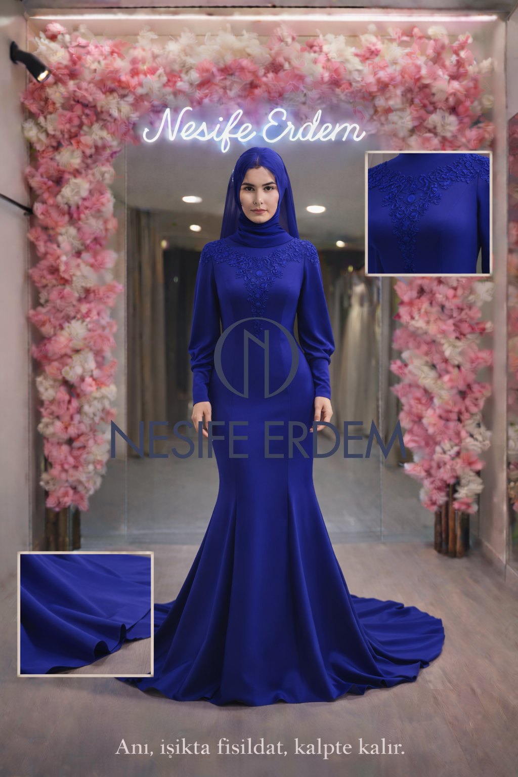 Ön orta hatta konumlanan dantel nakış, ton-sur-ton yaklaşımıyla yüzeyden taşmadan derinlik verir. Gövde kısmı fitted kurgulanır; belden aşağı doğru mermaid açılım, diz altından itibaren kontrollü genişler. Mat saten ana kumaş, içte destek katmanıyla structure kazanır; kol ve omuzda minimal form korunur, başörtüsüyle bütünlük sağlanır.