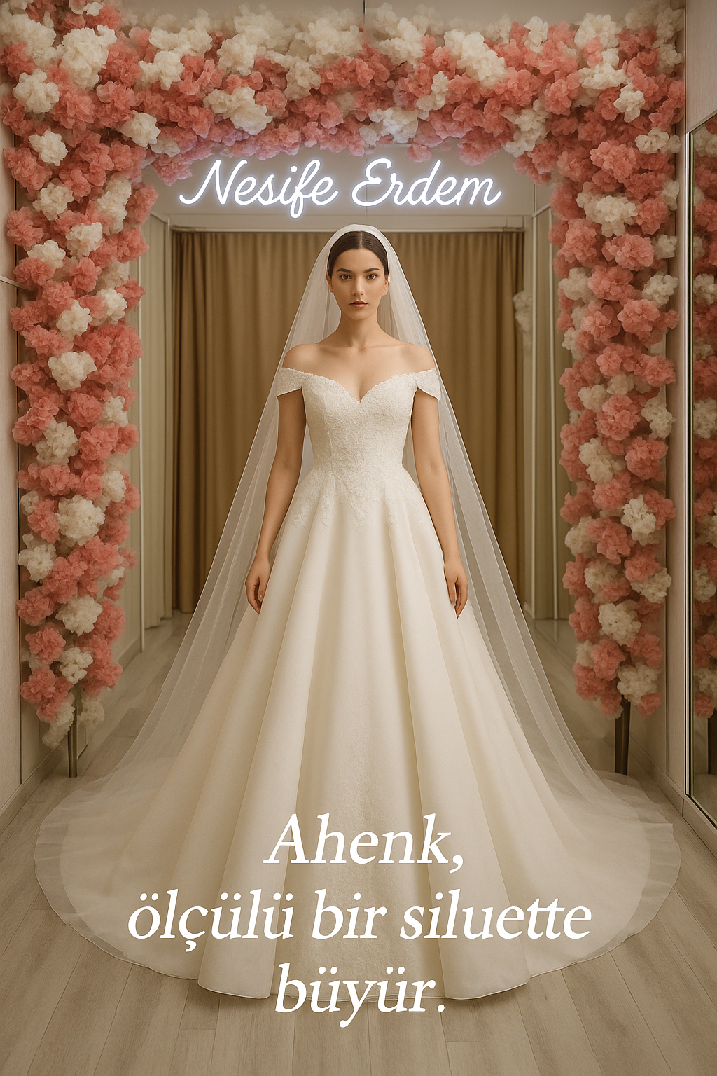 Nesife Erdem Gelinlik couture evreninde ölçü; kalıp tekniği, el işçiliği ve prova disiplininin aynı ritimde buluşmasıdır. Tesettür couture çizgisinde yaka–kol dengesi, büyük beden uyumunda bel hattının sakin kararı ve ipek saten/dantel dokuların kontrollü birleşimiyle, her bedende “taşınan” bir siluet hedeflenir. Koleksiyon yaklaşımını genel hatlarıyla koleksiyon evreni üzerinden inceleyebilir, atölye provalarının estetik arka planı için ilham dünyası akışına göz atabilirsiniz. Nesife Erdem Gelinlik+1