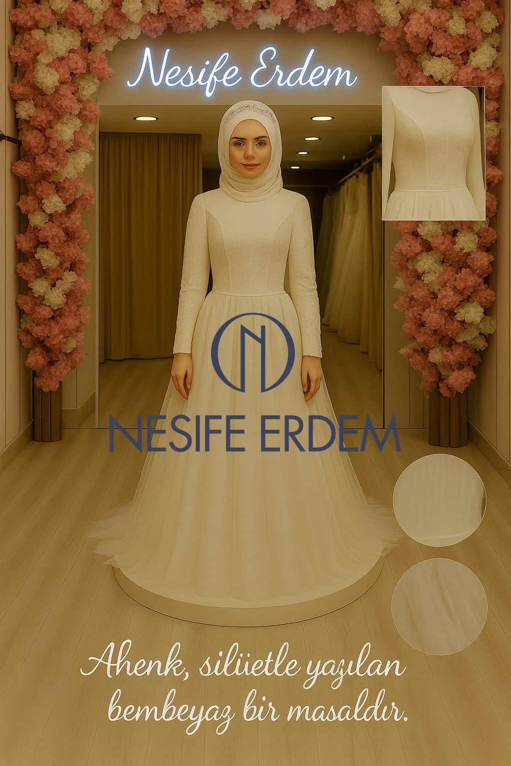 Couture evrenimiz; el işçiliği, özel dikim ve prova odaklı yaklaşımıyla tesettür couture dahil farklı stillerde ahenkli silüetler sunar. Modern-sade çizgi ile romantik dokuyu birleştiren detaylar, nikah/kına akışına uyumlu konforla tamamlanır. 2026 ruhuna yakın “timeless” duruş; zarif denge ve #couturestil akışında kendini gösterir.