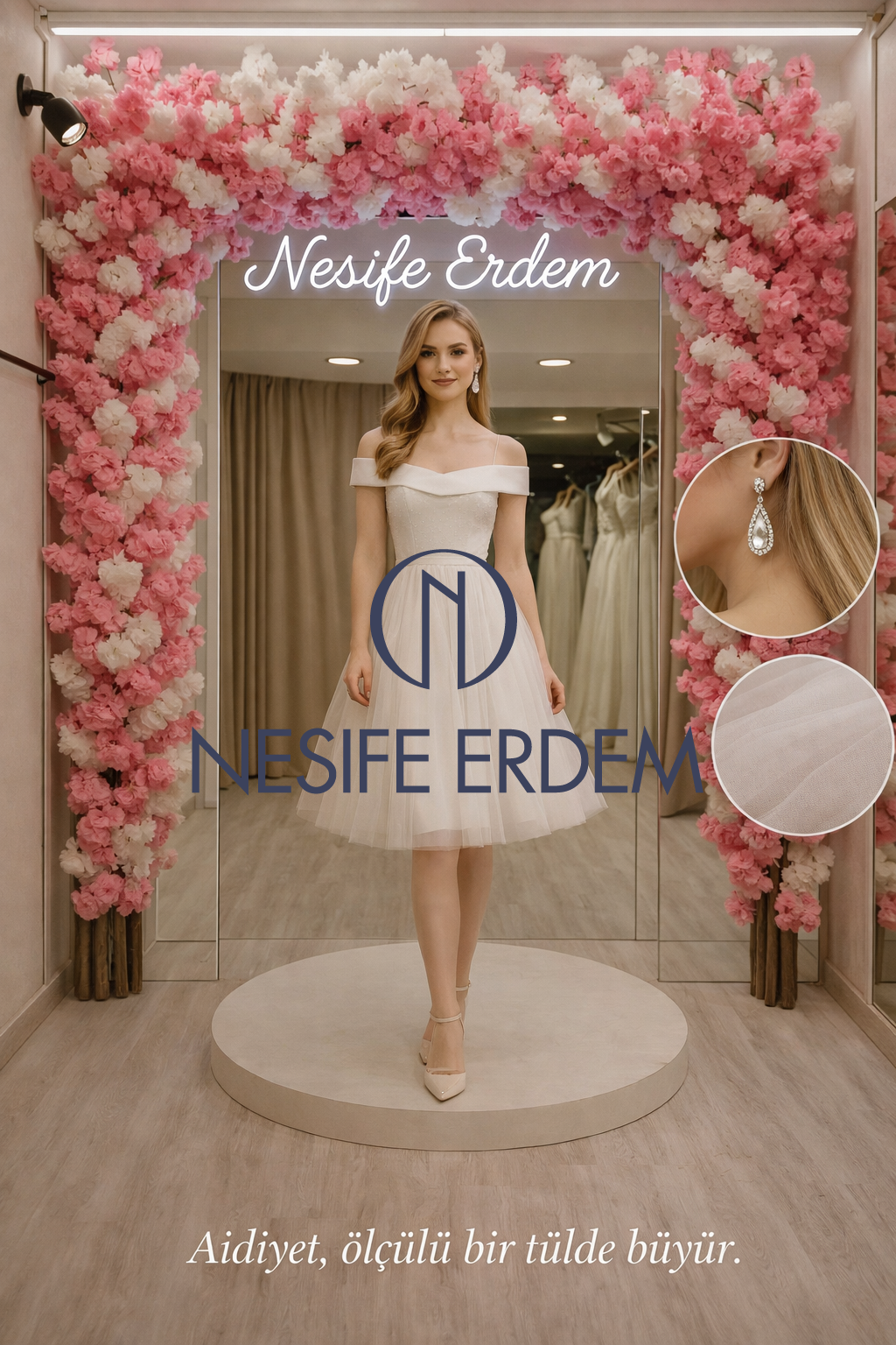 Kısa Açık Abiye, Nesife Erdem Gelinlik couture evreninde tül hafifliğinin ölçüyle dengelendiği bir form sunar. Açık siluet, el işçiliği ve özel dikim prova süreciyle birleşerek ferah ama kontrollü bir duruş oluşturur. Tasarım, tek bir ana odaklanmadan couture koleksiyon bütünlüğü içinde konumlanır.