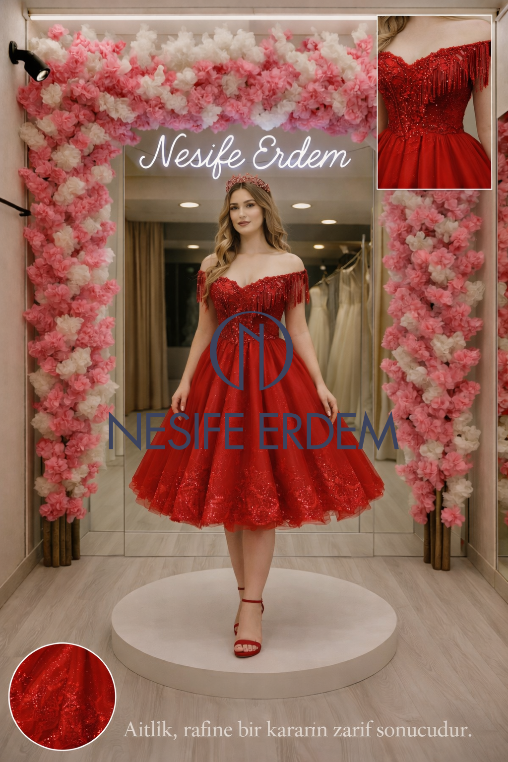 Kırmızı tonunun güçlü enerjisiyle hazırlanan bu kısa abiye tasarım, modern davet stilinin zarif bir yorumunu sunar. Dengeli kesimi ve sade çizgisi, hareketli ama rafine bir görünüm oluşturur.