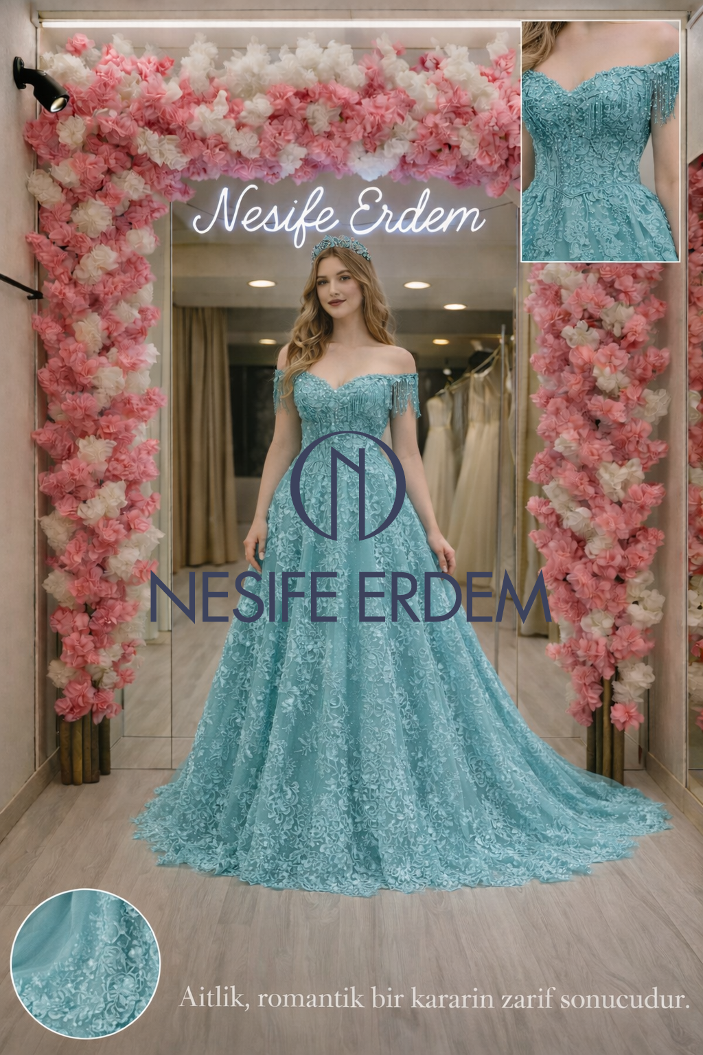 Turkuaz tonunun serin zarafeti ile prenses silüetin dengeli hacmi bir araya geldiğinde romantik bir couture görünüm ortaya çıkar. Dantel kaplama yüzey tasarıma hem hareket hem de zarif bir doku kazandırır. Bu model özel davetlerde güçlü ama romantik bir stil arayanlar için dikkat çekici bir alternatif oluşturur.