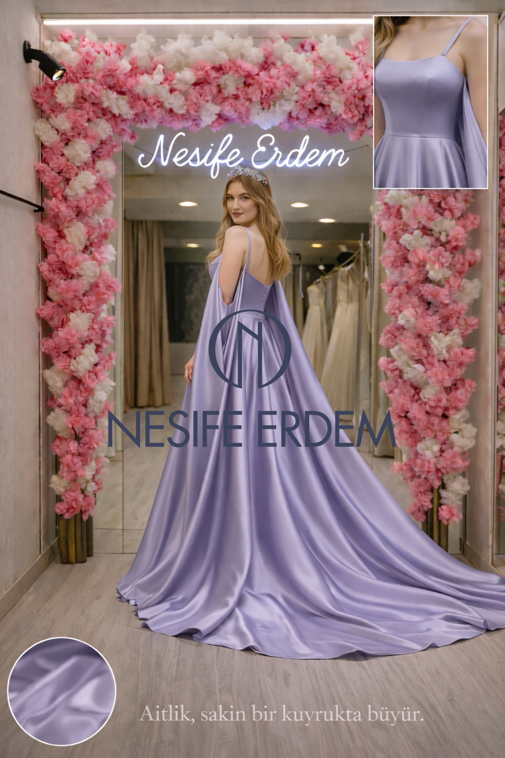 Lavanta tonunun yumuşak zarafeti ile prenses silüetin akıcı formu birleştiğinde romantik bir couture görünüm ortaya çıkar. Parlak saten kumaş ve uzun kuyruk detayı tasarımın zarif hareketini güçlendirir. Bu model özel davetlerde romantik ama etkileyici bir stil arayanlar için güçlü bir alternatif oluşturur.