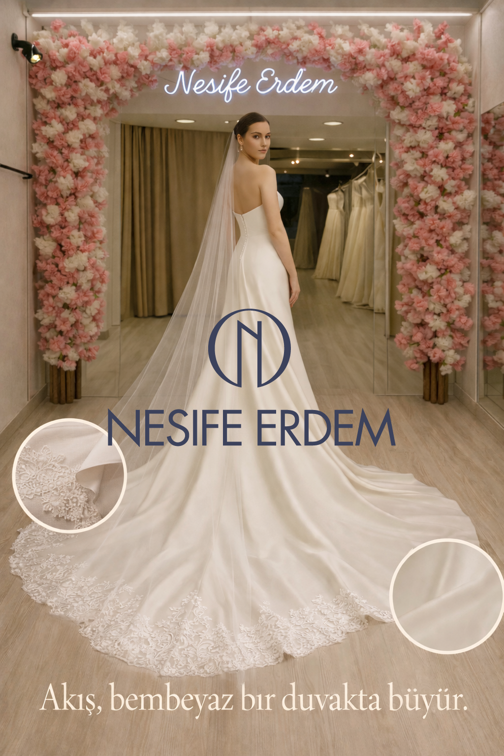 Bu tasarım, sade bir yüzeyde derinleşen bir zarafet sunar. Straplez üst yapı ve ipek saten etek, duvakla birleşerek bütüncül bir akış oluşturur.