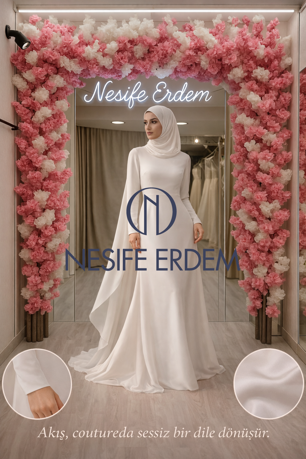 Model, minimal pattern cutting ile oluşturulmuş temiz bir silüete sahiptir. Üst beden vücuda hafif oturan soft structure formdadır. Bel hattı anatomik dengeye göre konumlandırılmıştır. Etek kısmı akışkan bir drape ile aşağıya doğru açılır. Pelerin detayı cape construction tekniğiyle eklenmiştir. Arka kapamada invisible zipper kullanılmıştır. Kumaş yapısı hafif ve mat yüzeylidir. Detaylı inceleme için [tesettürlü nikahlık modelleri] sayfasına göz atabilir, tasarım sürecini markanın Instagram hesabında takip edebilirsiniz. #sadenikahlık