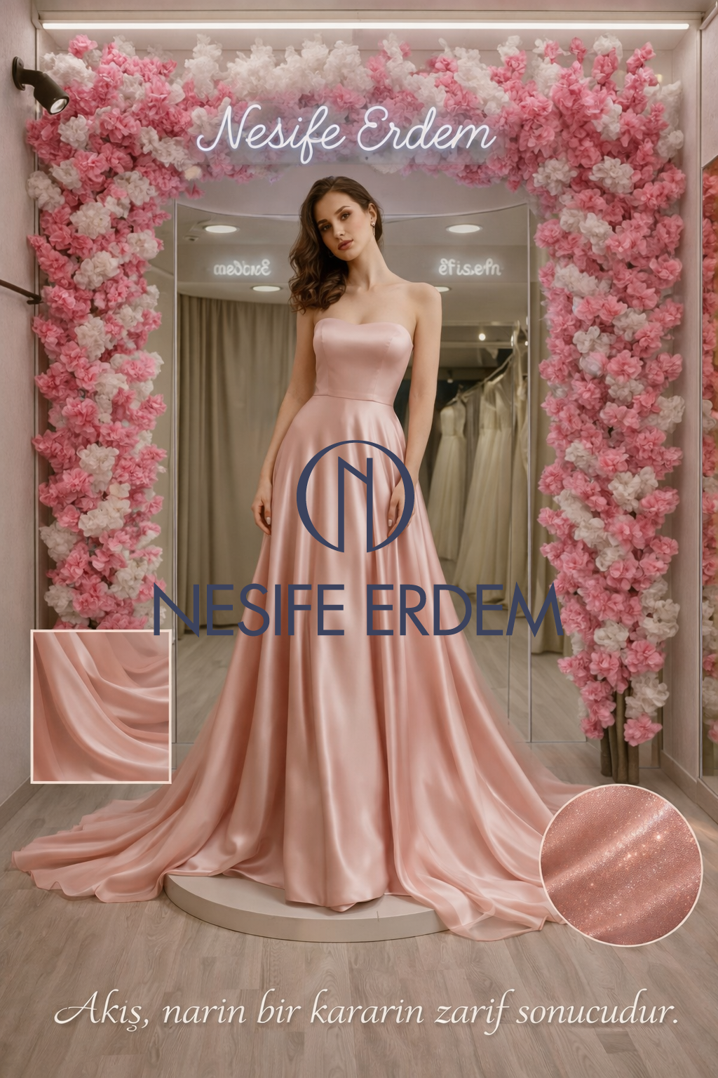 Akışkan ipek saten yüzeyi ve uzun kuyruk detayıyla sade ama etkileyici bir duruş sunar. Yumuşak tonu, güçlü silüetle dengelenir.