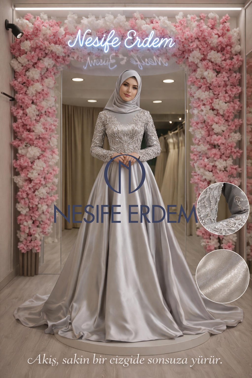 Sakin akış hissiyle tasarlanmış, ipek saten ve Fransız danteli dengesiyle zarif bir duruş sunan A kesim tesettürlü nişanlık modelidir.