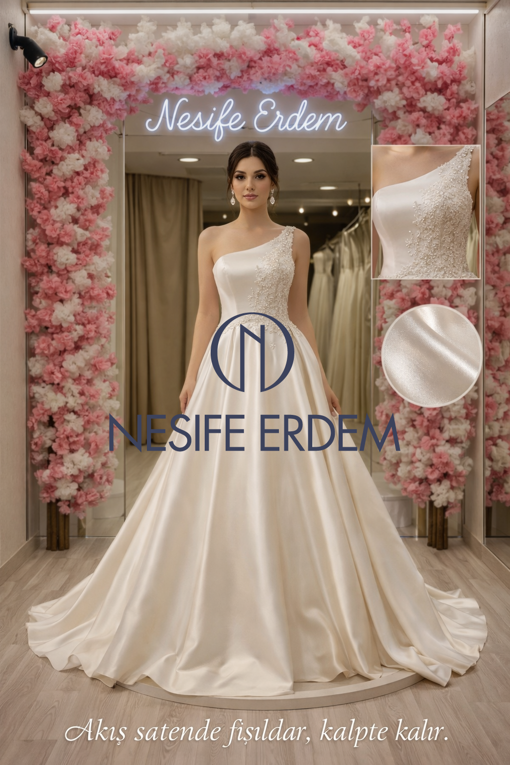 Bu açık nikahlık modeli, A kesim silüetin dengeli yapısını ipek saten kumaş ile buluşturur. Kumaş yüzeyi, ışığı yumuşak bir şekilde yansıtarak pürüzsüz bir görünüm oluşturur. Tek omuz detayı, tasarıma modern bir couture karakter kazandırır. Üst beden bölümünde yer alan Fransız danteli işleme, yüzeye üç boyutlu bir derinlik ekler. Drape tekniği sayesinde etek formu hareket sırasında akışını korur. İç kalıp yapısı, uzun süreli kullanımda konforu destekleyecek şekilde hazırlanmıştır. Koleksiyonun devamını keşfetmek için kategori sayfasını inceleyebilir, markanın tasarım dilini daha yakından görmek için Instagram hesabımıza göz atabilirsiniz.