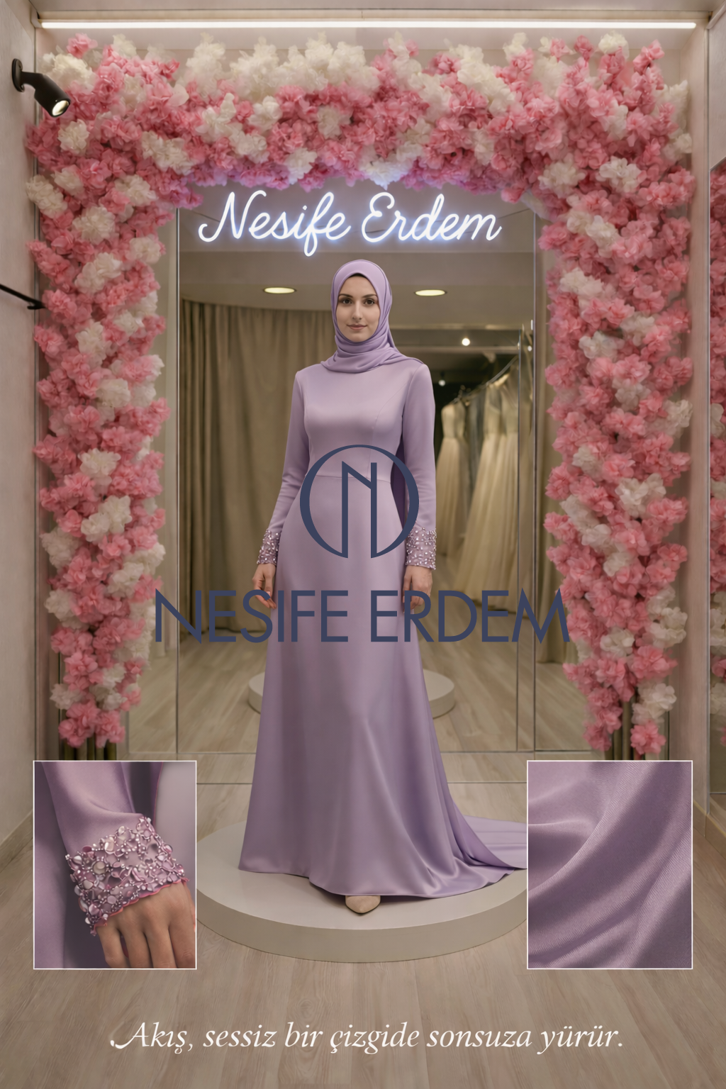 Yumuşak lila tonunda ipek saten kumaşla tasarlanan bu model, sade çizgilerle zarif bir silüet sunar. Minimal yapı, tasarımın rafine karakterini öne çıkarır.