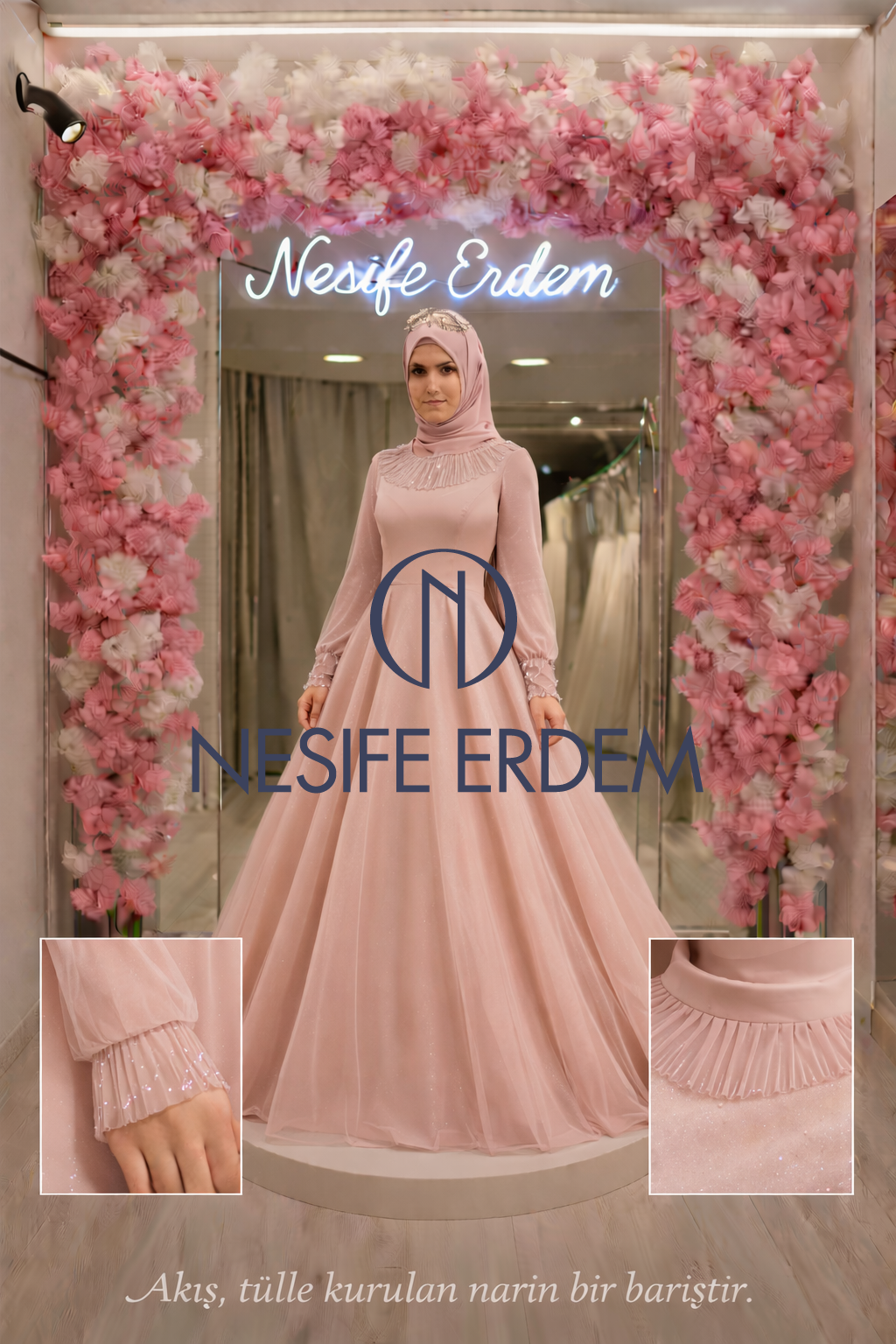 Hafif katmanlı tül yapısı ve dengeli A kesim formu ile akışkan bir silüet sunar. Blush pink tonu, sade bir romantizm hissi oluşturur.