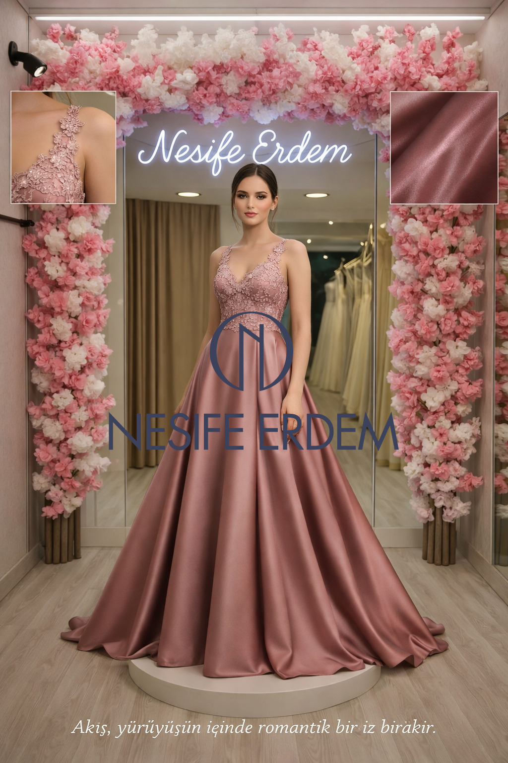 Romantik ve dengeli bir silüet sunan bu tasarım, hareketle birlikte anlam kazanır. Mat saten yüzeyi ve dantel üst formu ile zarif bir bütünlük oluşturur.