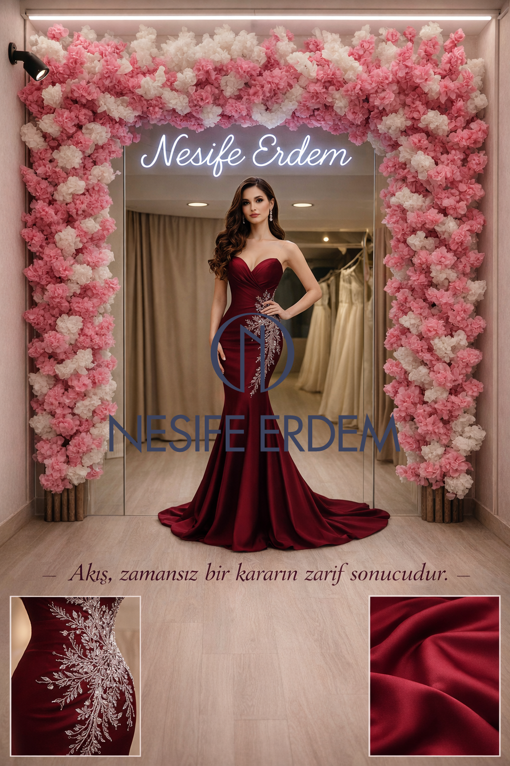 Vücuda oturan formu ve akışkan etek yapısıyla zarif bir silüet sunar. Mat saten yüzeyi ve ince işlemeleriyle sade ama güçlü bir duruş oluşturur.