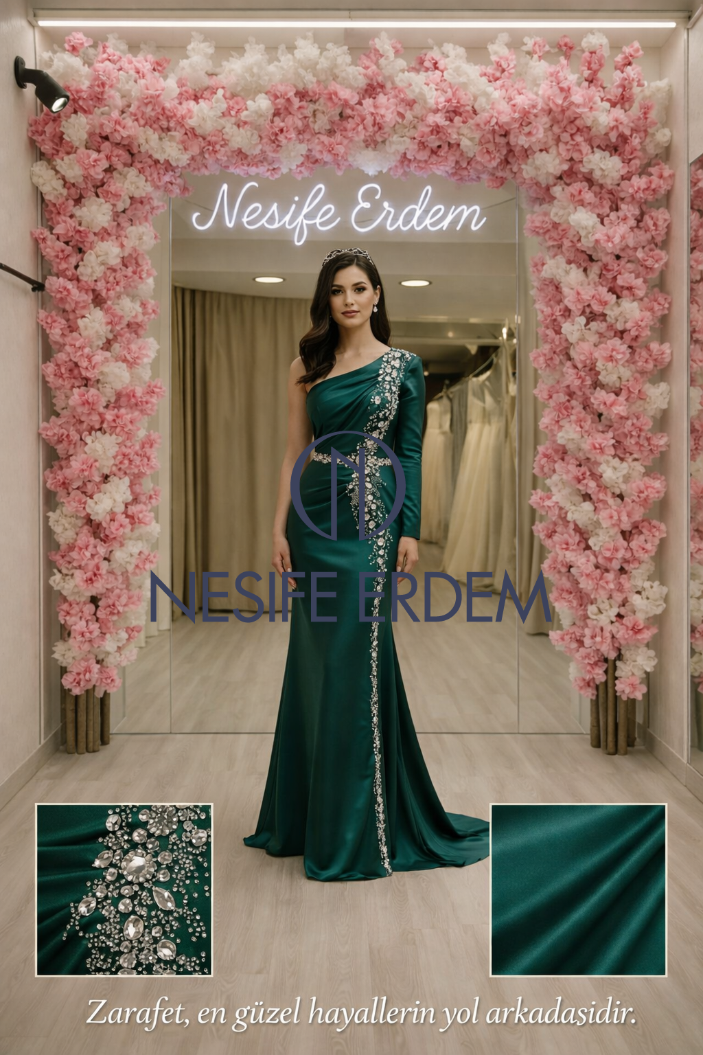 Derin zümrüt tonu ve taş işlemeli detaylarıyla dengeli bir ışıltı sunar. Krep saten yapısı sayesinde formunu koruyan zarif bir silüet oluşturur.