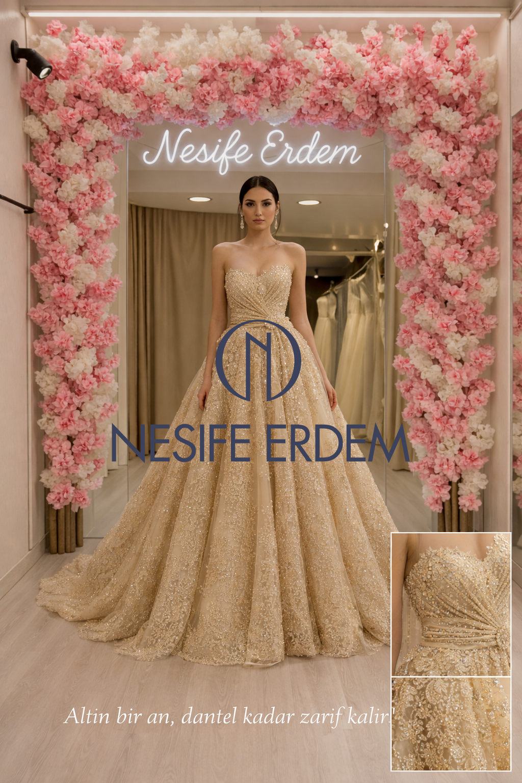 Katmanlı tül ve Fransız danteli ile zenginleşen bu tasarım, dengeli bir hacim ve zarif bir yüzey sunar. Gold tonun sıcaklığı ile zamansız bir duruş oluşturur.