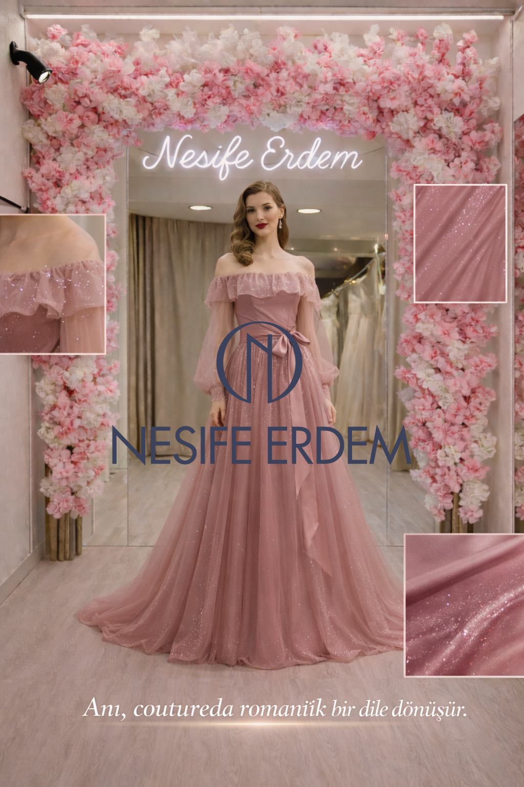 Romantik A kesim silüet, ışıltılı tül ve saten kuşakla dengelenir. Hafiflik ve zarafet bir arada sunulur.