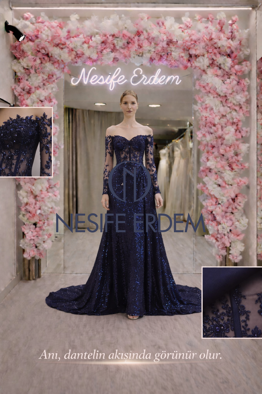 Dantel işçiliği ile derinleşen, mat satenin taşıyıcılığı ile form kazanan kuyruklu bir couture tasarım. Artistik duruşu ile klasik abiye algısını yeniden yorumlar.