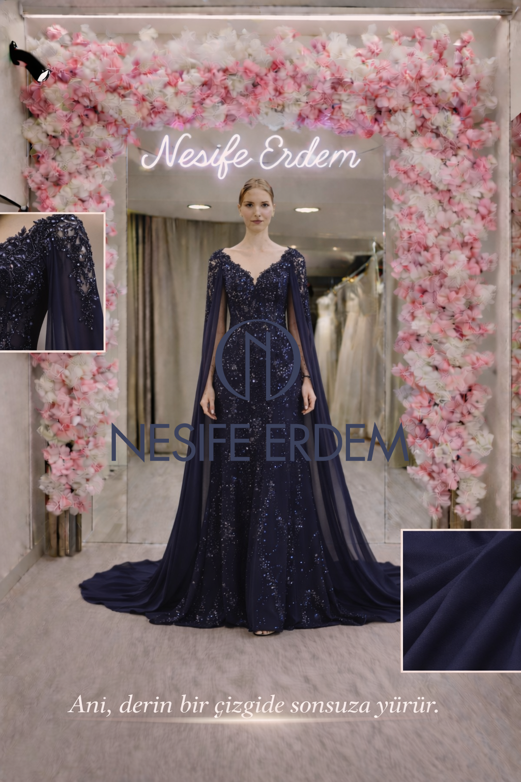 Bu model, vücuda oturan üst yapı ve aşağı doğru genişleyen form ile dengeli bir silüet oluşturur. Şifon kumaş, hafifliği sayesinde hareketi kesintisiz taşır. Alt katmanda kullanılan inset yapı, formu destekler ve yüzeye derinlik kazandırır. All over nakış uygulaması, tasarıma homojen bir doku verir. Pelerin kol detayı, omuzdan bağımsız düşüş sağlayarak ikinci bir hareket katmanı oluşturur. Kalıp yapısı kişiye özel hazırlanır ve prova sürecinde netleştirilir. Kuyruk formu, sürüklenmeden akacak şekilde optimize edilmiştir. Tasarım, estetik ve teknik dengesi ile öne çıkar.