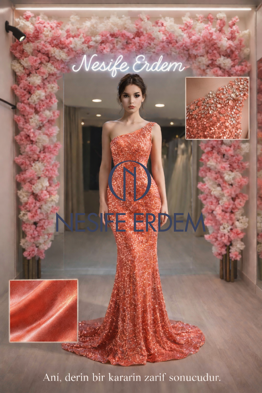 Bu model, tek omuz formuyla asimetrik bir silüet kurar. İpek saten kumaş, yüzeyde yumuşak bir akış sağlar. Üç boyutlu çiçek aplikasyonları, hacim ve derinlik üretir. Pul ve payet detayları, ışığı kontrollü şekilde yansıtır. Balık kesim, diz altından itibaren açılarak hareket özgürlüğü sunar. İç yapı, üst formun stabilitesini korur. Prova sürecinde omuz dengesi ve yürüyüş konforu test edilir. Son dokunuşta tüm detaylar ışık altında optimize edilir.