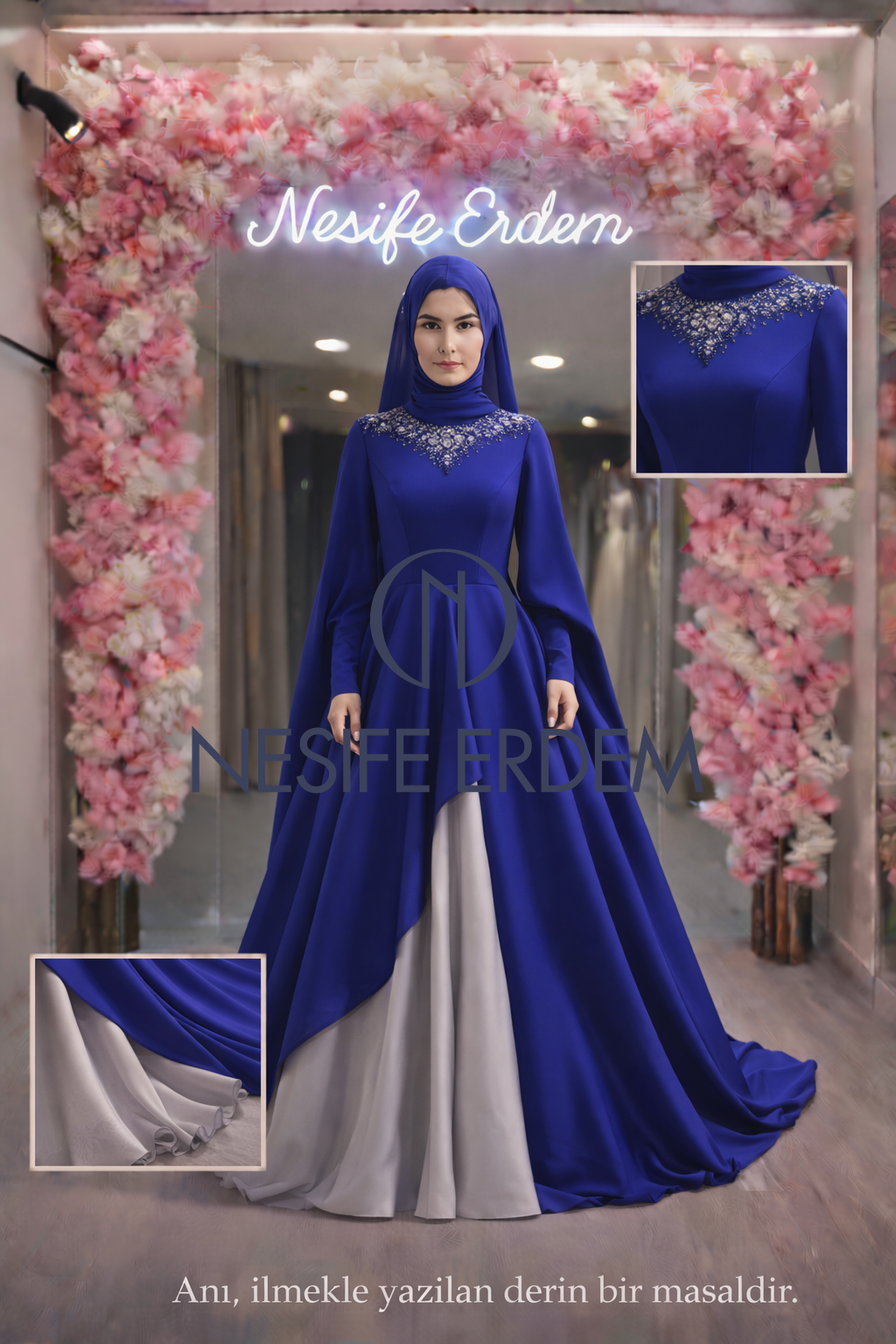 Bu model, A kesim kalıp ile hareket özgürlüğü sunarken asimetrik kesimiyle modern bir duruş kazandırır. Krep saten kumaş hem dökümlü hem form tutan bir yapı sağlar. Yaka bölümündeki taş işlemeler görsel odak oluşturur. Alt katmandaki kontrast ton hareketi destekler. Gün boyu konfor sunan dengeli bir tasarımdır. Mezuniyet ve özel davetler için idealdir.