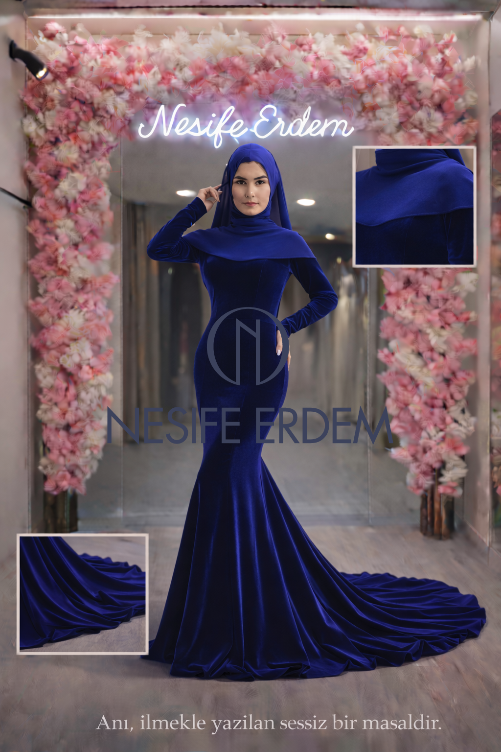 Derin saks tonu ve kadife dokusuyla öne çıkan, kuyruklu mermaid kesimiyle zarif bir silüet sunan tesettür abiye.