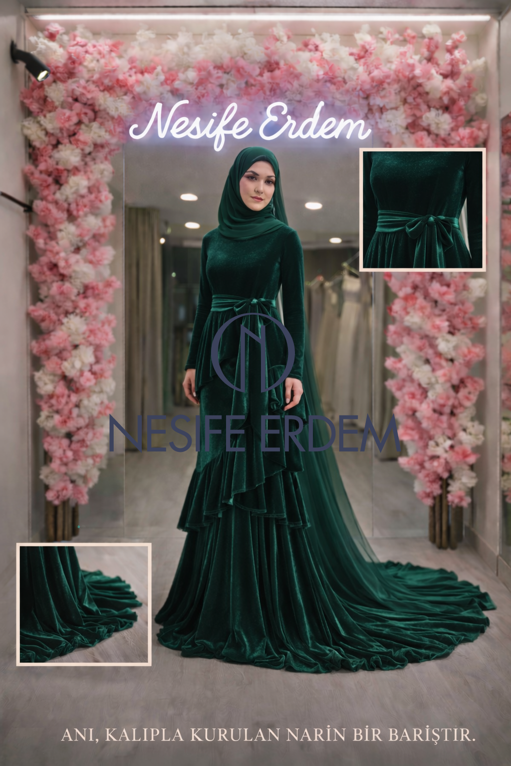 Zümrüt yeşili kadifenin derinliğiyle form bulan, kuşaklı ve fırfırlı A kesim tesettür abiye; dengeli akış ve zarif siluet sunar.
