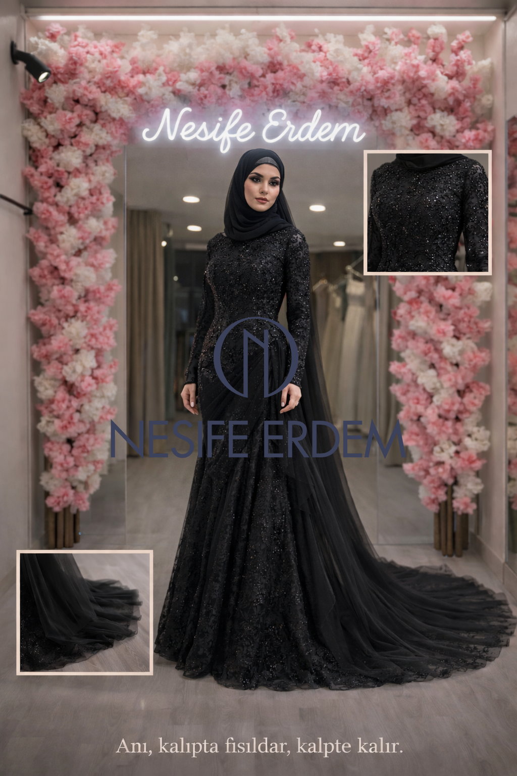 Siyah brokar yüzey ve drapeli etek yapısıyla zarif ve güçlü bir siluet sunan, katmanlı tül detaylı couture tesettür abiye.