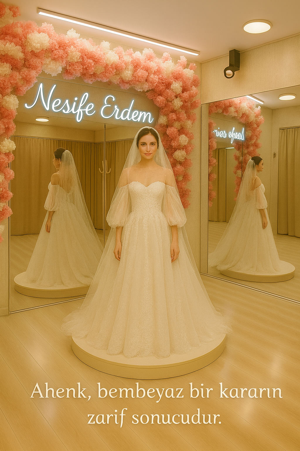 Mat ipek-saten zemin, hafif tül katman, kontrollü prenses hacmi; yüksek yaka, temiz kol formu ve ince dantel manşetlerle tesettür zarafetini netleştiren, minimal floral kemerle couture imza kazanan Aralık tasarımı. Akışkan etek ve uzun kuyruk dengesi, albüm karelerinde sade vitrin etkisi hedefler. Daha fazla bilgi için www.nesifeerdemgelinlik.com ve güncel prova paylaşımları için https://www.instagram.com/nesifeerdemgelinlik ; #tesetturgelinlik #couturegelinlik #prensesform #ipeksaten #danteldetay #gelinlikistanbul #nesifeerdemgelinlik.